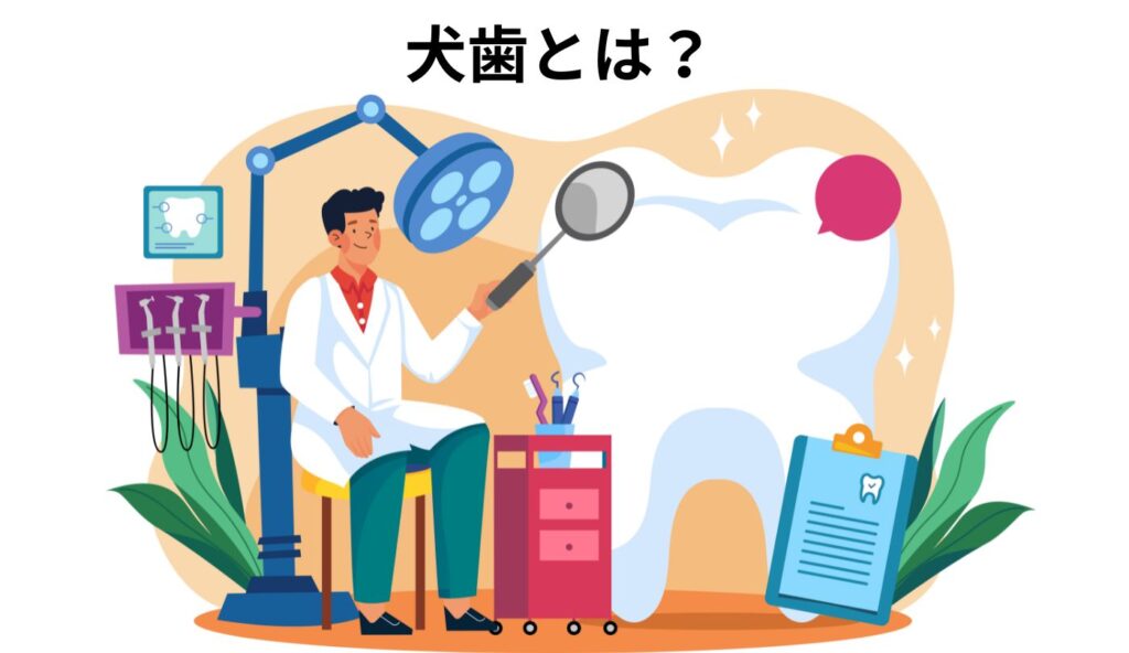 犬歯とは前歯から3番目の歯で、上下合わせて4本あり、尖った形状であることがわかりましたね。