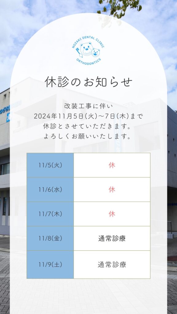 11月5日〜11月7日休診のお知らせ 改装工事に伴い、2024年11月5日(火)〜7日(木)まで休診とさせていただきます。 WEB予約に関しては休診中であっても可能です。どうぞよろしくお願いいたします。